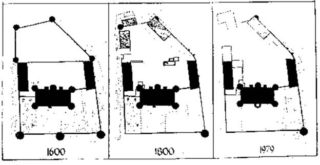 Toreinfahrt, Schlosshofmauern, Marstall, Meierei, Küchengebäude und Kanzlei bis